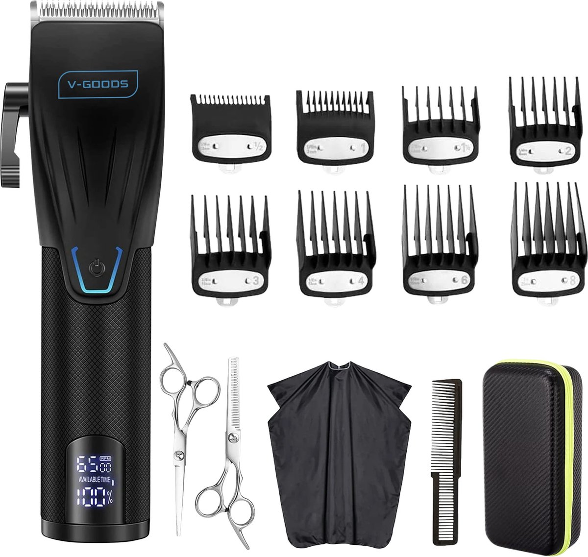 De V-Goods Professionele Tondeuse is dé kapperskwaliteit tondeuse die je thuis kunt gebruiken. Met deze professionele tondeuse kun je een perfecte coupe bewerkstelligen. Je krijgt 8 opzetstukken waarmee je verschillende kapsels kunt maken. De tondeuse is voorzien van een vermogen van 10000 RPM gemakkelijk te bedienen en heeft een comfortabele grip. Met de bewaarkoffer en mantel blijft je tondeuse in perfecte staat. Met deze tondeuse kun je voor een perfect kapsel zorgen, zonder dat je naar de kapper hoeft te gaan. De V-Goods Professionele Tondeuse is dé perfecte tool om thuis je eigen barber te worden.