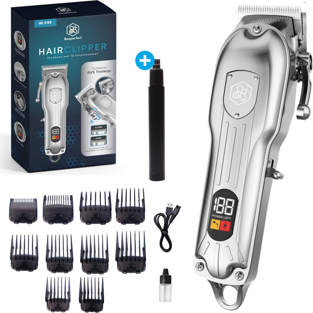 De Beeperfect® Professionele Tondeuse Mannen Haartrimmer Tondeuse Hoofdhaar 0.3 tot 25mm Gratis Neustrimmer is de perfecte keuze voor een strakke look. Deze krachtige trimmer heeft een keramische trimkop waarmee je hoofdhaar glad en egaal trimt. Je kunt kiezen uit verschillende snijdieptes, van 0.3 tot 25mm. De trimmer is licht van gewicht en heeft een ergonomisch design. Zo ligt de trimmer lekker in de hand en heb je de juiste grip voor een nauwkeurige trimbeurt. Het beste van alles is dat de Beeperfect® trimmer wordt geleverd inclusief een gratis neustrimmer. Met deze neustrimmer kun je je neusharen gemakkelijk bijhouden. En met het krachtige lithium-ion batterij heb je genoeg vermogen om al je haren te knippen, trimmen en stijlen. Daarnaast is de trimmer ook nog eens uitgerust met een snoerloos, oplaadbaar design. Je hoort nooit meer een gedoe met kabels.